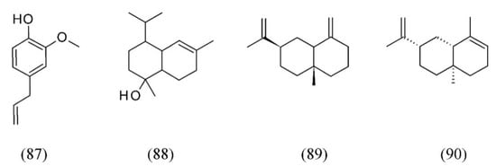 | Ocimum gratissimum | clove basil | eugenol (87), β-selinene (89), 1,8-cineole (74), β-caryo-phyllene (82), α-selinene (90) | None | [93] |