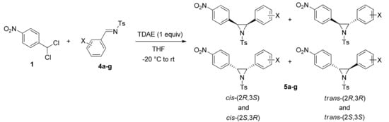 The reaction of 1-(dichloromethyl)-4-nitrobenzene 1 with two equiv. of aromatic N-tosylimines 4a–g in the presence of TDAE at −20 °C for 1 h, followed by 2 h at rt, led to a mixture of cis/trans isomers of the corresponding aziridines 5a–g in good yields (70–81%) as shown in Scheme 2 and reported in Table 1. Both electron-withdrawing and electron-donating substituents on the phenyl ring of the N-tosylimines were suitable for this reaction. 1H-NMR spectral studies identified the aziridines 5a–g as trans or cis isomers by their coupling constant. Two distinct doublets appeared in 3.39–4.60 ppm region with J = 4.3–4.7 Hz or J = 7.3–9.4 Hz, each of the signals corresponding to one proton. The low coupling constant here is consistent with a trans-isomer as reported in the literature [40], higher values being indicative of the cis-isomer of aziridine [41].