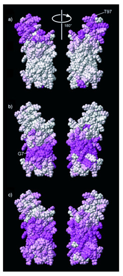 Paramagnetic relaxation enhancements of (a) Gd(DOTA), (b) 16-DSA and (c) 5-DSA on the membrane-bound protein OmpX. The darkness of the color indicates the size of the PREs with dark purple corresponding to highest PREs. Reproduced with permission from [19].