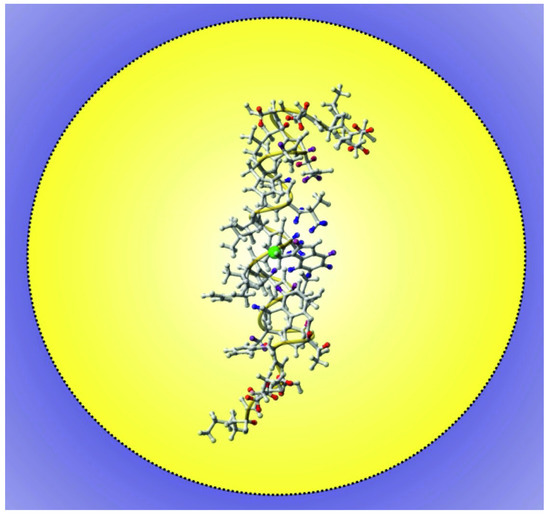 Deposits of amyloid peptides and proteins such as amyloid β-protein (Aβ), islet amyloid polypeptide (IAPP or amylin) and semen-derived enhancer of viral infection (SEVI) are involved in a variety of human diseases, including Alzheimer, Parkinson, Huntington and Creutzfeld-Jakob diseases, type II diabetes or HIV infection. They often contain hydrophobic regions, which bind to membranes. As an example, Aubin et al. [105] determined the structure and orientation of the conserved hydrophobic region (residues 110–136) of the human prion protein PrP(110–136) in DPC micelles. This peptide forms one stable α-helix in membrane-mimetics. The orientation was obtained by measuring signal intensity changes in 1H-15N-HSQC spectra in the absence and presence of Gd(DTPA-BMA). PrP(110–136) inserts into DPC micelles in a nonsymmetrical fashion. The N-terminus shows higher solvent PREs than the C-terminus, which indicates that the N-terminus is closer to the surface or even sticks out of the micelle. This localization of the peptide allows interactions between the guanidine group of Arg136 and the polar headgroups of DPC and also between the most hydrophobic region of PrP(110–136) with the core of the micelle (see Figure 7).