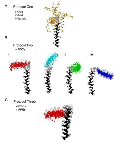 Structures of monomeric phospholamban obtained using (a) NOEs, dihedral angle restraints and hydrogen bonds, (b) all of the above plus residual dipolar couplings and (c) all of the above and PREs. Reproduced with permission from [43].