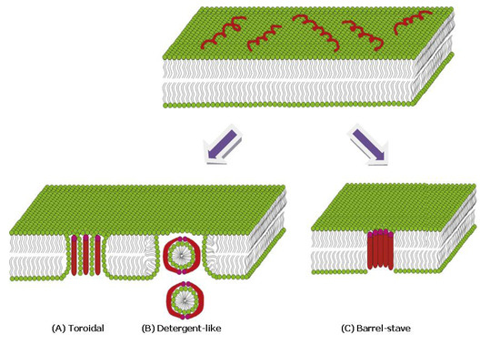 Proposed modes for membrane permeabilization by AMPs: (A) Formation of a toroidal pore, where the peptide as well as the detergent head groups face the interior. (B) Solubilization of membrane patches by a detergent-like mechanism. (C) The AMPs form an ion-channel-like pore, where only the hydrophilic residues of the peptide face the solvent. Adopted with permission from [62].