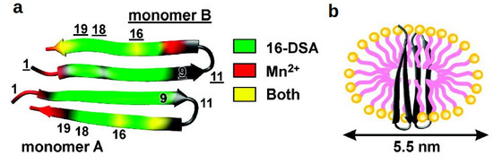 For each of these polypeptides that are disordered in solution, the neurotoxic state is attained through self-assembly into stable amyloid fibrils via a conformational transition from an α-helical structure upon membrane-binding to the final common β-strands association [106]. The 40 residue spanning peptide Aβ(1–40), which is related to the Alzheimer’s Disease, is the major amyloid plaque forming component after proteolytic cleavage from amyloid precursor proteins (APPs) and comprises a central hydrophobic cluster being responsible for the peptide aggregation upon membrane interaction [107,108]. PRE studies with Mn2+ and 5-doxyl stearic acid were carried out to study the positioning of the peptide in SDS micelles. It was shown that interaction with the membrane induces the formation of two helices in the centre and close to the C-terminus respectively, with their signal intensities being most affected by 5-doxyl stearic acid, while on the contrary those parts are well-protected from exposure to the Mn2+ ions, which clearly affect the unstructured termini as well as the central region between the helices [107]. The obtained data from this study suggest that the helices are located inside the micelle, with the central helix close to the surface and the C-terminal one buried into the interior of the micelle, while the flexible parts are located outside or at the surface of the membrane mimetic. Another study was carried out by Yamaguchi et al. to investigate the interaction between the two most common isoforms of Aβ, the above mentioned Aβ(1–40) and the more fibrillogenic and neurotoxic Aβ(1–42) by using PRE studies with the nitroxide radical MTSL [109].