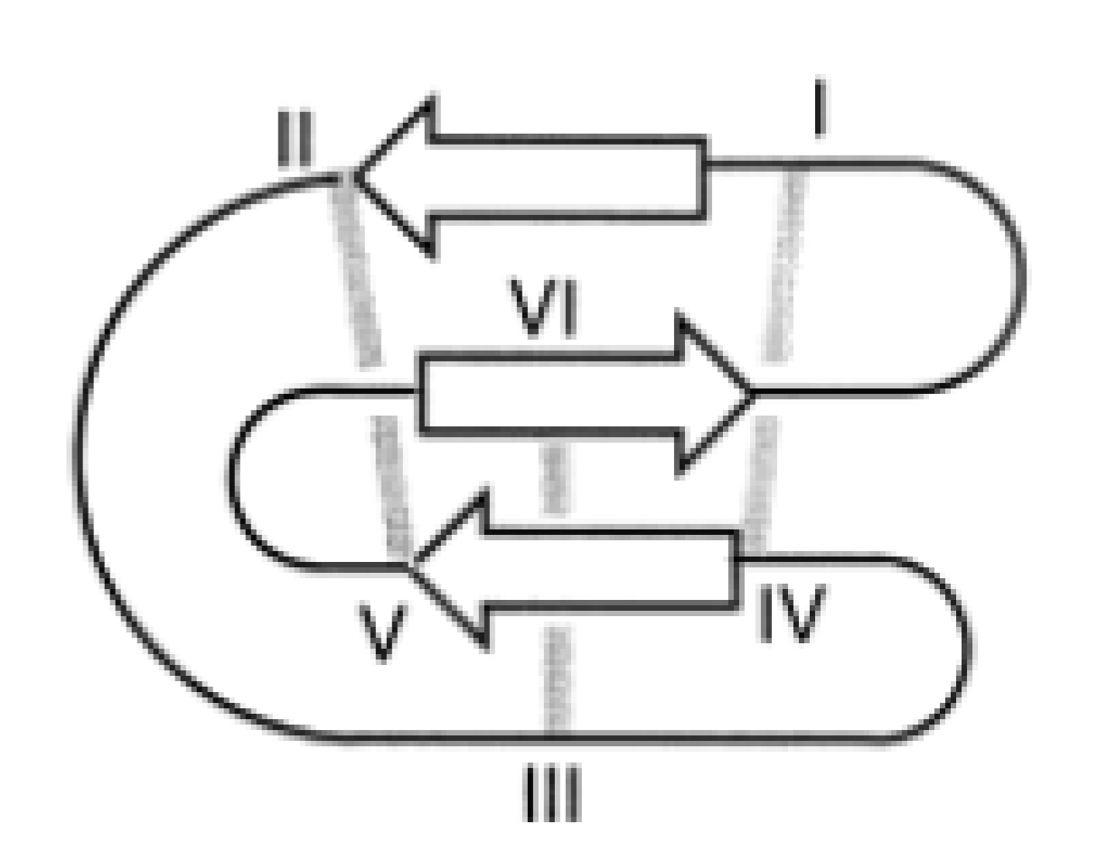 Schematic diagram of the cyclic cysteine knot with the cysteine residues labeled from I-VI and the resulting disulfide bonds shown as grey lines. Within the amide-cyclized backbone the disulfide bonds between the cysteines I and IV as well as II and V form the embedded ring being penetrated by the third disulfide bond between the cysteines III and VI. The β-sheets are represented by white arrows, forming the typical secondary structure element of cyclotides, a β-hairpin with a distorted third β-strand. Reproduced with permission from [81].
