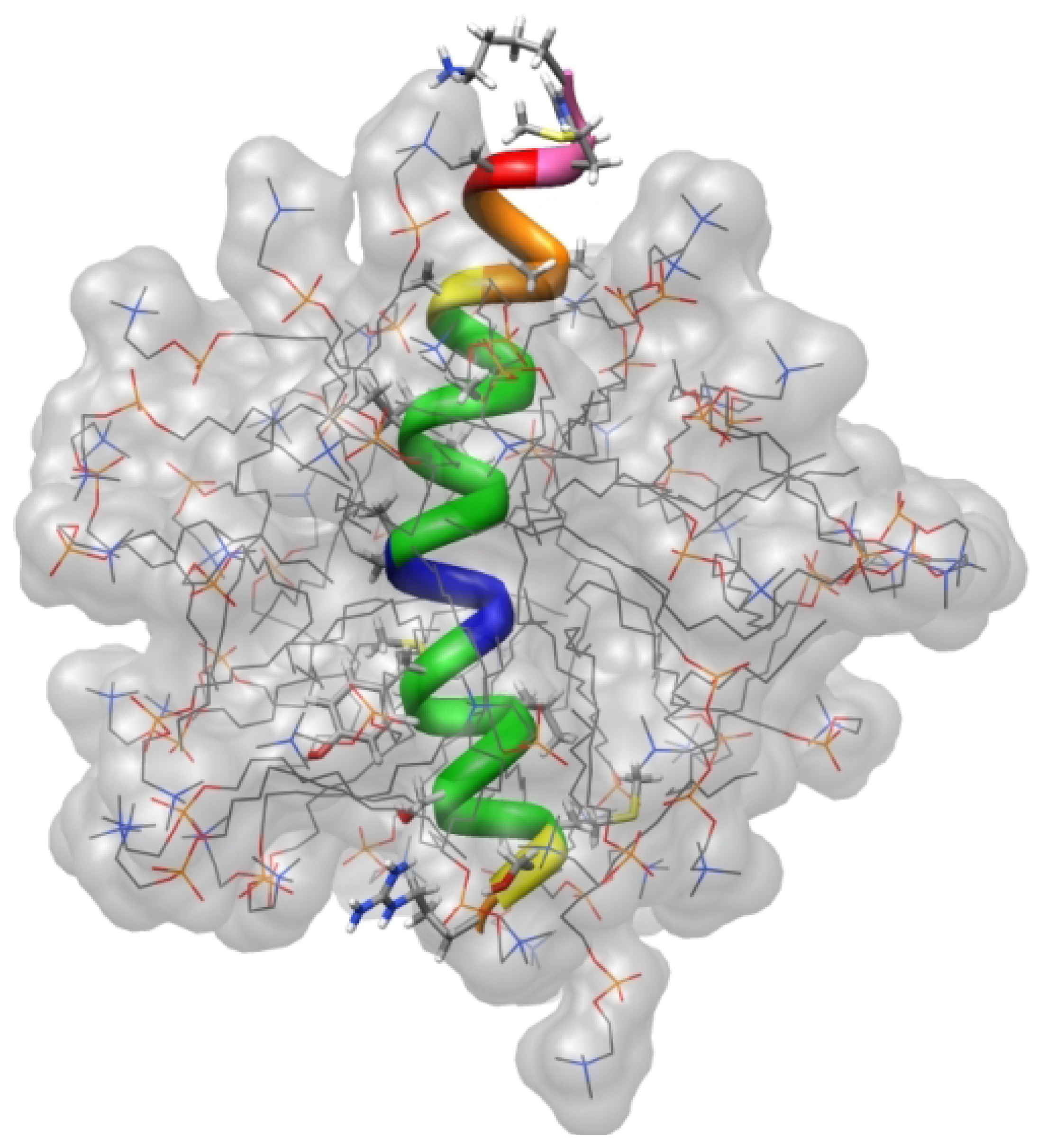 - Wang, Y.; Schlamadinger, D.E.; Kim, J.E.; McCammon, J.A. Comparative molecular dynamics simulations of the antimicrobial peptide CM15 in model lipid bilayers. Biochim. Biophys. Acta 2012, 1818, 1402–1409. [Google Scholar] [CrossRef]
