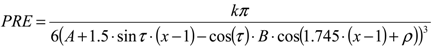 where the variable x is the residue number and A is the immersion depth of the first residue. The second term 1.5*sin(τ)*(x−1) describes the increasing membrane insertion by going along the peptide chain when the tilt angle is larger than zero. The factor of 1.5 is the helical pitch (in Å) per residue. The third term in Equation (1) accounts for the oscillating helical behavior and is given by cos(1.745x+ρ), where 1.745 × is equal to 2πx/3.6 and results from the periodicity of 3.6 residues per turn. B is the radius of the helix measured at the site of the nuclei under study. For a typical α-helical geometry this radius is 3.25 Å when measured at the site of Hα protons and 1.95 Å for NHs. The paramagnetic relaxation enhancement (PRE) exerted by a single paramagnetic center on a nucleus at a distance of r is given by a k/r6 dependence. Since we are interested only in the distance dependence, all other contributing factors are combined in the constant k. Addition of a paramagnetic agent to the solvent makes the whole environment of the membrane-mimetic paramagnetic. Therefore, the contributions of all paramagnetic centers need to be integrated, which results in a 1/d3 dependence of PRE on immersion depth d. The PRE as a function of helix positioning parameters is then given by: