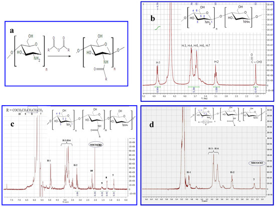 Characteristics of chitosans. (a) Reaction between chitosan and carboxylic acid anhydride, where R=(CH2)4CH3- hexanoyl-chitosan; R=(CH2)2 COOH- succinoyl-chitosan. (b–d) 1H-NMR spectra of (b) Chitosan with MM 200 kDa and DD 86% (c) Succinoyl chitosan with degree substitution (DS) 80% (d) Hexanoyl-chitosan with (DS) 10%.