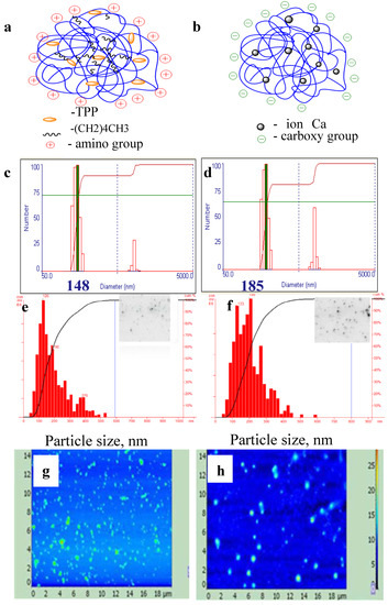 Hexanoyl-chitosan nanogels (HCNGs) were prepared by the ionotropic gelation method; the schematic structure of HCNGs is shown in Figure 2a. Succinoyl-chitosan nanogels (SCNGs) were formed by the Ca2+ coacervation method. Their schematic structure is shown in Figure 2b. Earlier HCNGs were prepared and studied by Desai and Park [20], where hexanoyl chitosan was synthesized and nanoparticles were prepared by the same methods. SCNGs prepared by coacervation method were developed by our group previously [21]. Other types of SC nanoparticles are widely described for biomedical applications [22,23,24].