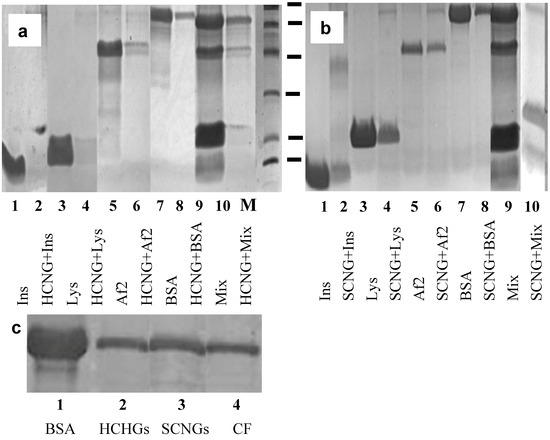 To support the results obtained with individual proteins, all four of them were mixed and loaded onto HCNGs or SCNGs. In the case of mixed proteins HCNGs bound exclusively negatively charged proteins bovine albumin and Aspergillus protein Af2 while SCNGs bound insulin and lysozyme both of which were positively charged (Figure 3a,b, lanes 9–10). Some amount of BSA in the sediment from SCNGs could be the result of co-sedimentation during high speed centrifugation.
