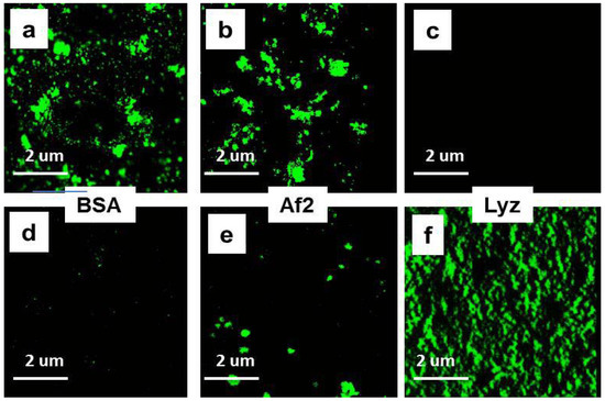 After incubation with proteins, NGs were separated from unbound proteins by high speed centrifugation and analyzed by gel electrophoresis (Figure 3a,b) while supernatants were used to estimate the amount of unbound proteins by bicinchoninic acid assay (BCA assay) (Table 3). The results demonstrated that the highest binding was found between NGs and proteins with different charges. The effect was more pronounced for low molecular weight proteins such as insulin and lysozyme (Figure 3a,b, lanes 1–4) and less evident for the proteins Af2 when analyzed by the electrophoresis (Figure 3a,b, lanes 5–6).