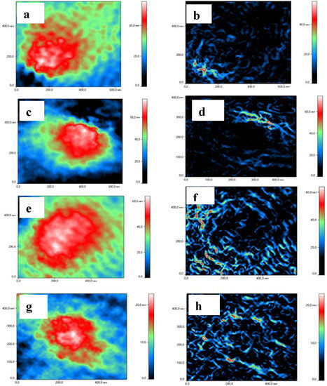 The particle size and poly-dispersity were analyzed by dynamic light scattering (DLS); atomic force microscopy; and nanoparticles tracking analysis (NTA) (Figure 2). Analysis of chitosan particles by DLS in multimode demonstrated the presence of two fractions with peaks of 150 and 650 nm for HCNGs (Figure 2c); 180 and 780 nm for SCNGs (Figure 2d). Close results were obtained by DLS by different groups [20,21]. However the process of particle formation is linear and depends on chitosan derivative and counteragent concentrations. Newly formed particles can aggregate however the aggregates may contain various numbers of nanoparticles, otherwise there must be some mechanisms regulating DLS bi-modal distribution. Atomic force microscopy and especially NTA demonstrated that aggregates were distributed randomly with rare particles larger than 500 nm in diameter (Figure 2e–h). Desai and Park [20] have also demonstrated that the diameter of HC nanoparticles was between 54 to 724 nm with a mean diameter of 324 nm.