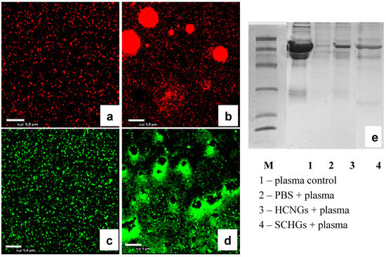 Confocal images of fluorescent HCNGs (a,b) and SCNGs (c,d) before (a,c) and after incubation for 30 min with diluted blood plasma. (e) Gel-electrophoresis of blood plasma loaded onto NGs (line 1); collected in the sediment after centrifugation (line 2); or eluted from NGs (lines 3–4) shows differences in protein spectra. Bar corresponds to 5 um.