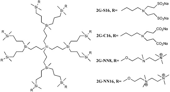Although the clinical safety [23,24] and antiviral activity [9,25] of SPL7013 had been verified, the lack of broad spectrum anti-HIV activity was the main defect of SPL7013 [9]. A new water soluble anionic carbosilane dendrimer with sulfonate end-groups (2G-S16) has been synthesized aiming at achieving more effective and larger spectrum virucidal activity against HIV (Figure 2).
