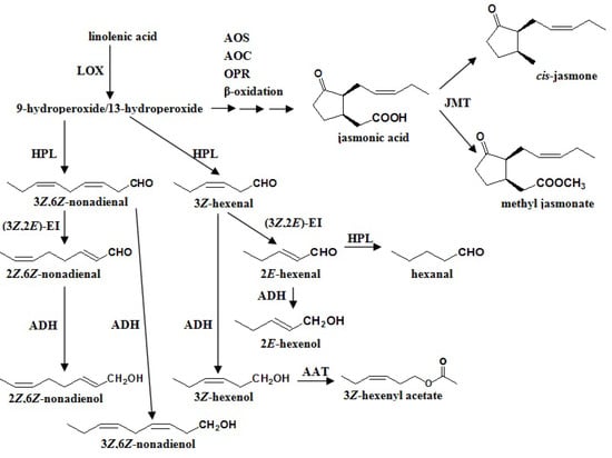 Linolenic acid-derived flavor molecules.AAT, alcohol acyl CoA transferase; ADH, alcohol dehydrogenase; AER, alkenal oxidoreductase; AOC, allene oxide cyclase; AOS, allene oxide synthase; HPL, hydroperoxide lyase; JMT, jasmonate methyltransferase; LOX, lipoxygenase; OPR, 12-oxo-phytodienoic acid reductase; 3Z,2E-EI, 3Z,2E-enal isomerase.