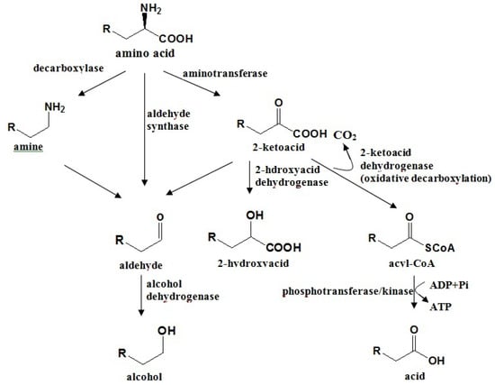 Amino acid, such as alanine, valine, leucine, isoleucine, phenylalanine and aspartic acid, are also involved in aroma biosynthesis in fruit as direct precursors, and their metabolism is responsible for the production of a broad number of compounds, including alcohols, carbonyls, acids and esters [,]. Most of the information available to date on the biosynthesis of amino acid-derived volatiles in plants is based on precursor feeding experiments with radio-labeled, stable-isotope-labeled, or unlabeled precursors. The general scheme of biosynthesis is thought to proceed in a similar way as that in bacteria or yeast, where these pathways have been studied more extensively [,]. Amino acids can undergo an initial deamination or transamination leading to the formation of the corresponding α-keto acid (Scheme 2). Subsequent decarboxylation followed by reductions, oxidations and/or esterifications give rise to aldehydes, acids, alcohols and esters []. Branched chain volatile alcohols, aldehydes and esters in fruits such as banana, apple, strawberry and tomato arise from the branched chain amino acids leucine, isoleucine and valine [,,,]. These amino acids can also be the precursors of acyl-CoAs, which are used in alcohol esterification reactions catalyzed by AATs. Indeed, isoleucine could give rise to 3-methylbutanol and 2-methylbutyryl-CoA, both used in an esterification reaction to yield the ester 3-methylbutyl 2-methylbutanoate in banana []. Methionine could be the precursor of sulphur-containing volatiles such as dimethyldisulfide and volatile thioesters []. In strawberry, it has been suggested that alanine serves as a precursor for volatile ethyl esters, which can be produced by AAT [,].