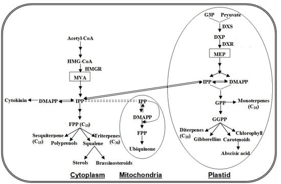 - Newman, J.D.; Chappell, J. Isoprenoid biosynthesis in plants: Carbon partitioning within the cytoplasmic pathway. Crit. Rev. Biochem. Mol. Biol. 1999, 34, 95–106. [Google Scholar] [CrossRef]