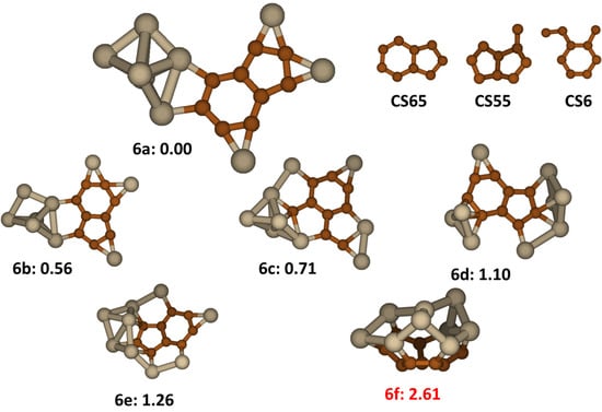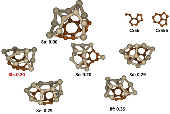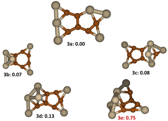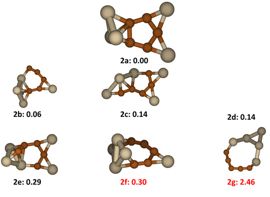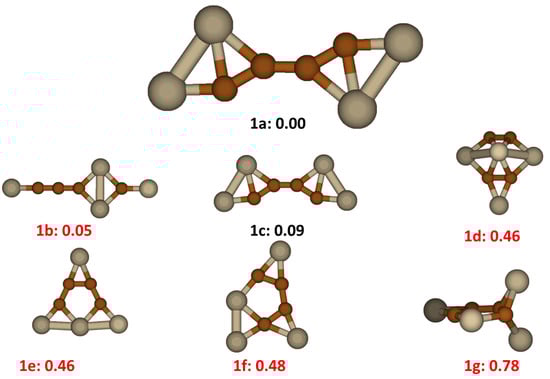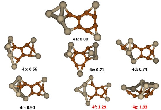 The structures and relative energies (in eV) of the lower energy Si4C4 clusters. Structures labeled in red have been previously reported in literature as 1b [], 1d [,,], 1e [], 1f [], 1g [].