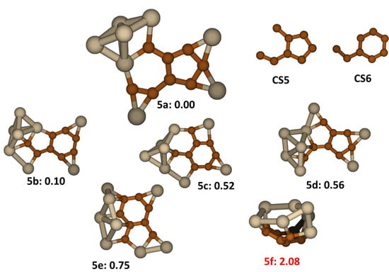 The lowest energy structures are show in Figure 5. We find that the lowest energy isomer, 5a, has CS5 segregation with Cs symmetry. The dangling bonds of C atoms in CS5 are capped in the carbon plane by three individual Si atoms and two Si atoms from a small cluster of five Si atoms. In 5a, the average bond distance for C-C bonds is 1.43 Å, for Si-C bonds is 1.87 Å and for Si-Si bonds is 2.38 Å. Isomer 5b which has energy +0.10 eV higher contains a CS6 segregation and also has Cs symmetry. The rest of low-lying energy structures, except 5f, either have CS5 or CS6 carbon segregation. Like 5a, from 5b to 5e, all the structures have a character that a molecular plane formed by a C segregation is surrounded by individual Si atoms and a Si clusters. Structure 5f displayed in the same figure was previously reported as the lowest energy isomer for Si8C8 []. In this work we could reproduce the same structure but we found it to have a much higher energy than all of the low energy structures shown in Figure 5. In structure 5f the carbon atoms form a curved CS5 segregation which fuses together with Si segregation forming a cage like structure similar to 4f described above.