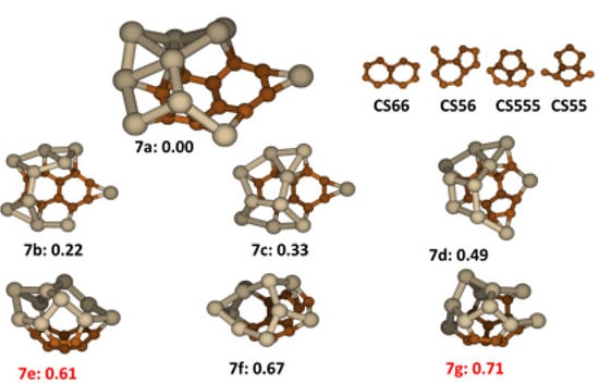 The low lying energy structures of Si7C7 clusters, displayed in Figure 4, all contain either a C6 ring or a C5 ring. The most stable isomer, 4a, has a carbon segregation in form of a C6 ring with a C atom attached to it. The average C-C bond distance is 1.41 Å, which suggests conjugation in the C segregation. Dangling bonds of the carbon segregation are saturated by two individual Si atoms bridging two C-C bonds in the plane as well as by Si atoms of a Si5 cluster for two other carbon atoms. The whole structure has Cs symmetry. The average Si-C bond is 1.90 Å and the average Si-Si bond is 2.44 Å. The next low energy isomer, 4b, which is significantly higher in energy compared to 4a, has a backbone composed of C5 and SiC4 fused rings. The average C-C bond distance is 1.43 Å. Similar to 4a, the dangling bonds of C atoms are saturated by 2 individual Si atoms and a Si5 cluster. The remaining low lying energy structures, except 4g, have the similar segregation feature as 4a or 4b. Isomer 4f, reported by Zang et al. [] is a planar structure resembling 4b, less one Si-C linkage. It is found to have energy 1.29 eV higher than the lowest energy isomer. Isomer 4g found in our work to have a very high energy compared to the most stable structures was also studied previously, reported in the literature as the lowest energy Si7C7 structure []. In 4g, C and Si atoms form two segregation regions which then fuse to each other forming a cage like structure. This segregated cage like structure is not favored energetically compared other stable structures of Si7C7. However, this type of cage becomes more stable in clusters having higher n.