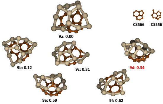 The structures and relative energies (in eV) of the lower energy Si9C9 clusters and carbon segregations. Structure 6f is previously reported in ref. [].