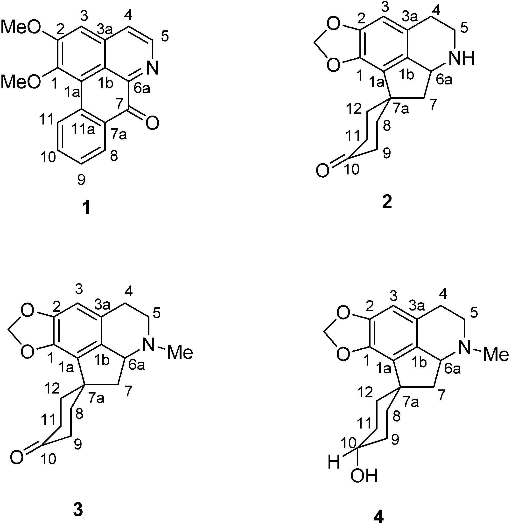 Phoebe grandis is locally known in Malaysia as “medang ketanah or tanah” [30,31]. A proaporphine alkaloid which occurs in P. grandis is used as a precursor in the synthesis of aporphines and proaporphine-tryptamines alkaloids [25]. These alkaloids are known for their unique pharmacological activities, as demonstrated by liriodenine which shows antitumor, antibacterial, and antifungal activities [27]. Biological screening on the crude alkaloidal extract of the leaves of Phoebe grandis for antiplasmodial activity has shown positive results too: IC50 < 8 µg·mL−1 [32]. Although, most of the species of Phoebe are rich in alkaloidal contents, a few species are also reported as alkaloid-free [33]. We have launched a chemical investigation on the extract. Further investigation of the leaves has now led to the isolation of a known oxoaporphine alkaloid, lysicamine (1), and three proaporphine alkaloids, litsericinone (2), 8,9,11,12-tetrahydromecambrine (3) and hexahydro-mecambrine A (4) (Figure 1). Compounds 2 and 3 were isolated for the first time as natural compounds. Compound 4 has also been isolated from Phoebe scortechinii [34] and was previously synthesized by Nakasato [35].