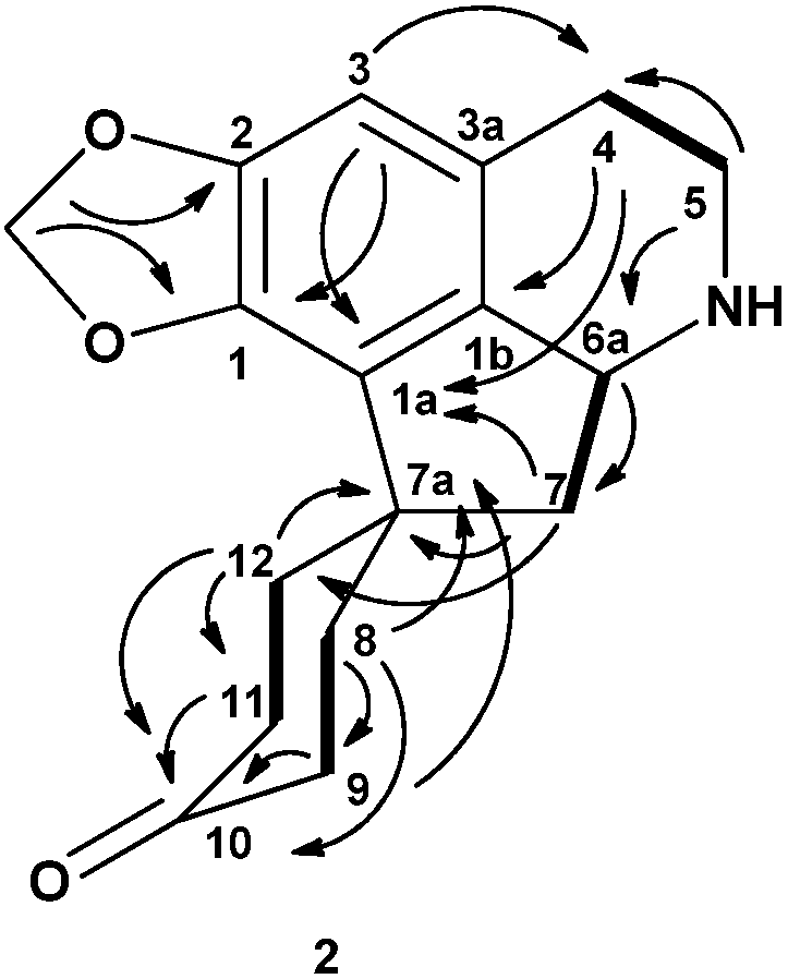 = −25 (c = 0.00004, CHCl3). The LCMS-IT-TOF mass spectrum of this proaporphine type of alkaloid showed a [M+H]+ peak at m/z = 300.1596 which correlated to the molecular formula C18H21NO3 (calcd. for C18H22NO3, 300.1521). The UV spectrum showed an absorption peak at 203 nm. The IR spectrum showed a very significant carbonyl absorption peak at 1712.80 cm−1 due to C=O stretching vibrations. The presence of the methylenedioxyl group was proven by its characteristic absorption peaks at 1254.45 and 944.84 cm−1, which indicate the asymmetric C-O-C stretching.The 1H-NMR spectrum displayed a pair of doublet peaks at δ 5.88 (d, J = 1.2 Hz) and 5.83 (d, J = 1.2 Hz) that correspond to the methylenedioxyl group at positions C-1 and C-2. A singlet peak appeared at δ 6.49 representing a proton attached to a benzene ring at the C-3 position. There is a strong singlet peak at δ 2.39 indicating a N-methyl group. The aliphatic protons appeared between δ 1.70 to 3.30. These peaks supported were by the COSY experiment that showed correlation peaks between H5ax/H4ax, H4ax/H5ax, H6a/H7ax, H7ax/H6a, H6a/H7eq, H7eq/H6a, H11/H12ax, H12ax/H11, H11/H12eq and H12eq/H11. The 13C-NMR spectrum of 3 showed the presence of eighteen carbons and the DEPT experiment showed the presence of seven methylene carbons (CH2) and one methylenedioxyl group. The carbonyl group at C-10 position resonated at δ 211.65 and the N-methyl group at δ 43.47. The quaternary carbon at the C-7a position appeared at δ 46.04. The assignments of all carbons were established through the aid of the HSQC and HMBC experiments (Table 2). Figure 3 shows the HMBC and COSY correlation of the 8, 9, 11, 12-tetrahydromecambrine (3).