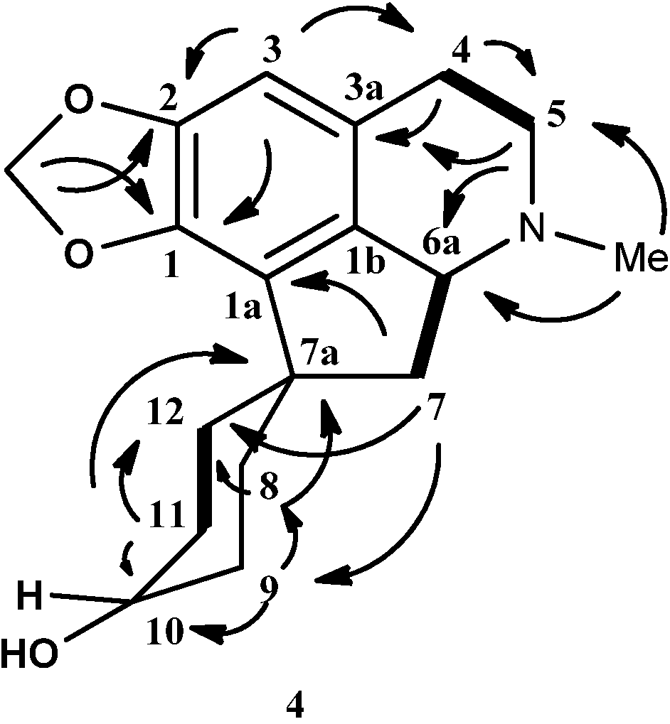 The 13C-NMR spectrum of 4 showed the presence of eighteen carbons, which is in agreement with the molecular formula C18H23NO3. The DEPT spectrum showed the presence of one N-methyl, eight methylenes, three methines and six quaternary carbons. The methylenedioxyl group resonated at δ 100.5. The characteristic proaporphine quaternary spirocarbon peak C-7a appeared at δ 46.6. Apparently, C-10 resonated at δ 67.1, further strengthening the hypothesis of H-10 being axial. The complete assignments of all protons and carbons were aided by the HSQC and HMBC correlation and HMBC data were recorded in Table 3. Figure 4 showed HMBC and COSY correlations of hexahydromecambrine A. The structure of 4 resembled the structure of 3 except for the fact that the carbonyl group in 3 was reduced to a hydroxyl group in 4.