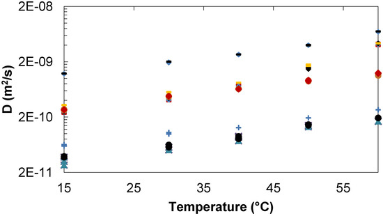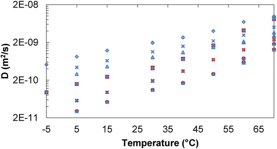 - Ekdawi-Sever, N.; de Pablo, J.J.; Feick, E.; von Meerwall, E. Diffusion of sucrose and α,α-trehalose in aqueous solutions. J. Phys. Chem. A 2003, 107, 936–943. [Google Scholar] [CrossRef]