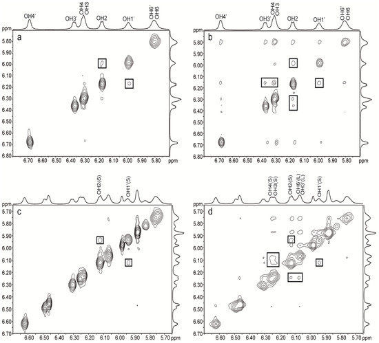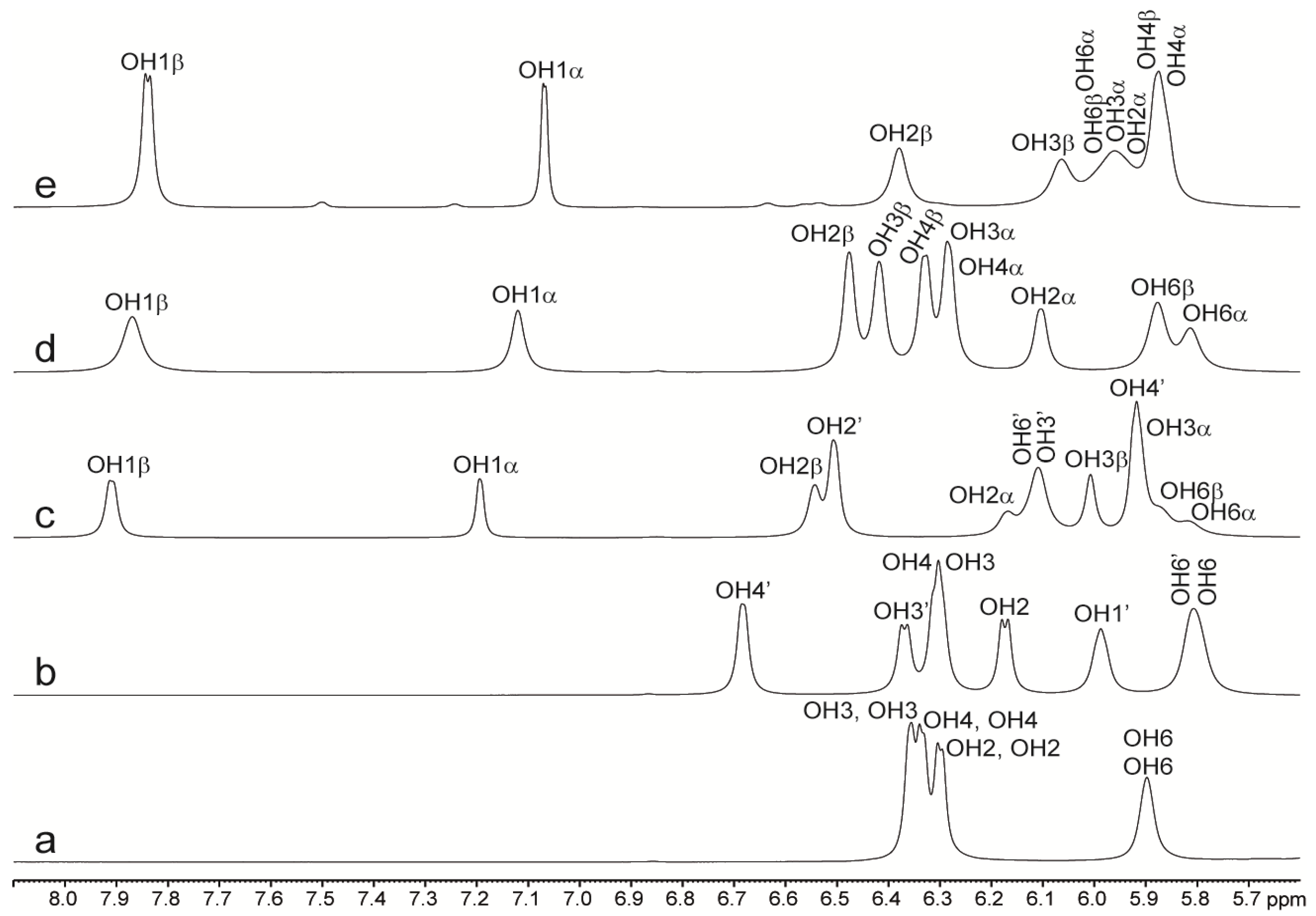 - Sandstrom, C.; Baumann, H.; Kenne, L. The use of chemical shifts of hydroxy protons of oligosaccharides as conformational probes for NMR studies in aqueous solution. Evidence for persistent hydrogen bond interaction in branched trisaccharides. J. Chem. Soc. Perkin. Trans. 2 1998, 2385–2393. [Google Scholar] [CrossRef]