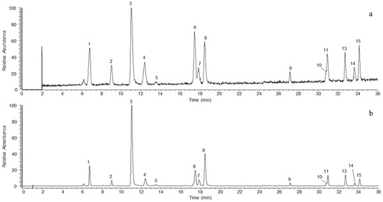 UHPLC-ESI Total Ion Current (TIC, a) and UHPLC-UV (λ 280 nm, b) chromatograms of standard working solutions. Procyanidin B1 (1), catechin (2), chlorogenic acid (3), procyanidin B2 (4), 4-caffeoylquinic acid (5), epicatechin (6), procyanidin C1 (7), 4-p-coumaroylquinic acid (8), procyanidin B5 (9), hyperin (10), phloretin xyloglucoside (11), phloridzin (13), avicularin (14) and quercitrin (15).