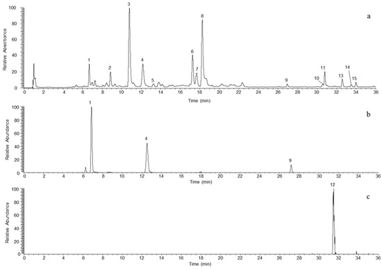 UHPLC chromatograms: (a) UV (λ 280 nm); (b) SRM for procyanidin; (c) SRM for rutin. Procyanidin B1 (1), catechin (2), chlorogenic acid (3), procyanidin B2 (4), 4-caffeoylquinic acid (5), epicatechin (6), procyanidin C1 (7), 4-p-coumaroylquinic acid (8), procyanidin B5 (9), hyperin (10), phloretin xyloglucoside (11), rutin (12), phloridzin (13), avicularin (14) and quercitrin (15).