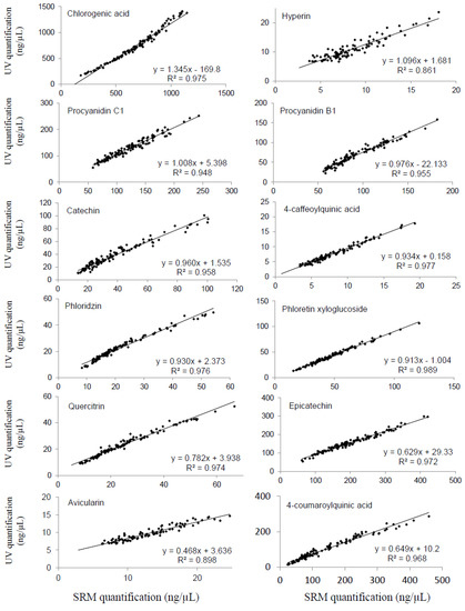 For all standards, the concentrations measured by the two methods in apple juices were in agreement over the range of calibration, with correlation coefficients r2 > 0.948, except for avicularin and hyperin, with r2 = 0.898 and r2 = 0.861, respectively (Figure 3). The slopes of the linear regression obtained by comparison of the quantification of 120 apple juices with the UV-PDA detector and the ESI-triple quadrupole mass spectrometer (Figure 3) ranged from 0.468 (avicularin) to 1.345 (chlorogenic acid). For hyperin, procyanidin B1, procyanidin C1, catechin, 4-caffeoylquinic acid, phloridzin and phloretin xyloglucoside, the slope values (around 1.0 ± 0.1) indicated that UV quantification was in accordance with MS/MS quantification.