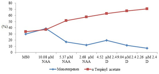 The results also indicated qualitative and quantitative variations of constituents in the two periods analyzed. They showed a remarkable difference between VOCs composition from the mother plant and in vitro callus, differences of components from the callus obtained with NAA, 2,4-D and MS0 and a direct correlation between the percentage of α-terpenyl acetate and the other monoterpenes in the callus of 20 and 40 days of inoculation (Figure 3). The presence of terpinolene and kessane was only qualitatively detected in the callus grown for 40 days (Table 2), whereas the hydrocarbon 1-octen-3-ol was seen in the callus grown for 20 days.