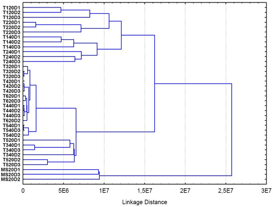 The HCA analysis confirmed that the same treatment groups obtained by PCA are also evident using a dendrogram (Figure 6). The same groups were identified among the samples evaluated using two different chemometric techniques. Thus, these results corroborate many of the conclusions above described.