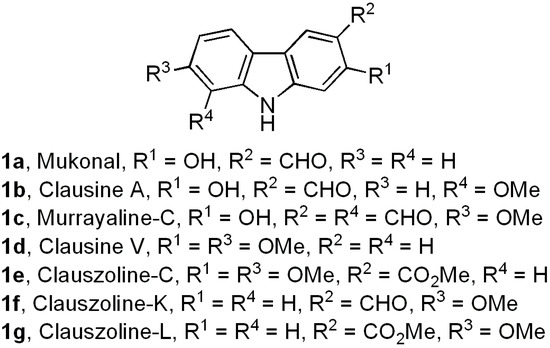 Biologically active carbazole alkaloids, a family of natural products with a variety of molecular structures, are isolated from higher order plants of the genera Clausena, Glycosmis, Micromelum, and Murraya (Rutaceae), among other sources [1,2,3,4,5]. Specifically, a great number of 2-, 5-, 6-, 7-mono- and bis-oxygenated tricyclic carbazoles isolated from these genera [1,2,3] exhibit a broad range of significant biological activities, including compounds with anti-tumor [6,7], antiplatelet aggregative [8], antibiotic [6,9,10], anti-viral [11,12,13], anti-plasmodial [14], anti-convulsant [15], and sigma receptor antagonist [16,17] properties. Carbazole derivatives 1a–g are examples of these natural alkaloids [8,18,19,20,21,22,23] (Figure 1).