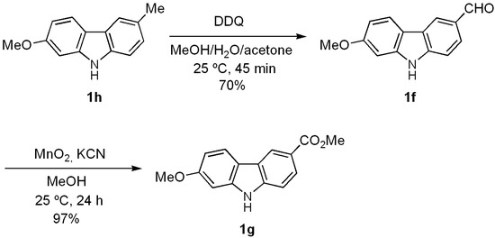 With the aim of testing the utility of this methodology for the total synthesis of natural 7-oxygenated tricyclic carbazoles, we carried out the conversion of derivative 1h into clauszoline-K (1f) and clauszoline-L (clausine C, 1g). Thus, upon applying the well-known procedure [58,59] for the synthesis of these [32] and other natural carbazoles [44], carbazole 1h was treated with DDQ in a mixture of MeOH/H2O/acetone (1:1:1) at room temperature for 45 min to give 1f in 70% yield (Scheme 3).
