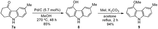 When a mixture of 7a, Pd/C (10%) (5.7% mol) and anhydrous MeOH was heated in a sealed vessel to 270 °C for 48 h, 5-hydroxy-3-methylcarbazole (8) was isolated and then purified in good yield (Scheme 4). Methylation of the latter under the usual reaction conditions provided the desired natural carbazole 9, which was synthesized in four steps with high overall yield (53%). The spectral data of 9 agree with those described for the natural [60,61] and synthetic [33,62] products.