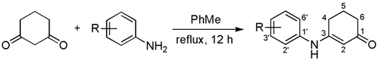 3-(p-Tolylamino)cyclohex-2-en-1-one (4a) [63]. In a 250 mL, three necked, round-bottomed flask equipped with a magnetic stirring bar, rubber septum, a water condenser and a Dean-Stark trap, under N2 atmosphere, a mixture of 2 (0.400 g, 3.57 mmol) and 3a (0.382 g, 3.37 mmol) in dry toluene (150 mL) was stirred at reflux for 12 h. The solvent was removed under vacuum, and the residue purified by column chromatography over silica gel (10 g/g of crude, hexane/EtOAc, 1:1) to give 4a (0.66 g, 92%) as a pale yellow solid. Rf 0.15 (hexane/EtOAc, 1:1); mp 248–249 °C. IR (KBr): νmax 3214, 3029, 2937, 1573, 1512, 1361, 1311, 1245, 1183, 1141, 818 cm−1. 1H-NMR (500 MHz, CDCl3): δ = 1.98 (qu, J = 6.5 Hz, 2H, H-5), 2.31 (br t, J = 6.5 Hz, 2H, H-6), 2.32 (s, 3H, CH3), 2.48 (t, J = 6.5 Hz, 2H, H-4), 5.48 (s, 1H, H-2), 6.99–7.03 (m, 2H, H-2′), 7.07–7.11 (m, 2H, H-3′), 7.12 (br s, 1H, NH). 13C-NMR (125 MHz, CDCl3): δ = 20.9 (CH3), 21.8 (C-5), 29.5 (C-4), 36.4 (C-6), 99.0 (C-2), 124.0 (C-2′), 129.7 (C-3′), 135.3 (C-4′), 135.5 (C-1′), 163.1 (C-3), 198.1 (C-1). MS (70 eV): m/z (%) 201 (M+, 74), 184 (26), 173 (100), 144 (53), 130 (29), 106 (13), 91 (12), 77 (10). HRMS (EI): m/z [M+] calcd for C13H15NO: 201.1154; found: 201.1156.