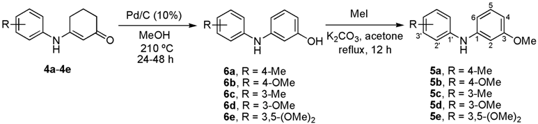 Conversion of 3-anilino-2-cyclohexen-1-ones 4a–e into diarylamines 6a–b, 6d–e and 5a–e a.
