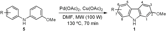 In spite of the large number of 2-, 5-, 6-, 7-mono- and bis-oxygenated tricyclic natural carbazoles that have been isolated, the wide range of functional groups and substitution patterns that exists among these compounds, and their important pharmacological activity, only recently a considerable number of synthetic approaches for their efficient preparation have been published [1,2,3,24,25,26,27,28,29,30,31,32,33,34,35,36].