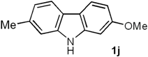 2-Methoxy-7-methyl-9H-carbazole (1j). Following the procedure described for 1h, with 5c (0.100 g, 0.47 mmol), Pd(AcO)2 (0.0105 g, 0.047 mmol) and Cu(AcO)2 (0.211 g, 1.17 mmol), 1j (0.081 g, 82%) was obtained as a white solid. Rf 0.61 (hexane/EtOAc, 7:3); mp 162–163 °C [Lit. [68] 280 °C]. IR (film): νmax 3399, 1654, 1047, 1025, 995, 827, 766 cm−1. 1H-NMR (500 MHz, DMSO-d6/acetone-d6, 3:7): δ = 2.46 (s, 3H, CH3), 3.85 (s, 3H, CH3O), 6.75 (dd, J = 8.5, 2.5 Hz, 1H, H-3), 6.95 (dd, J = 8.3, 1.0 Hz, 1H, H-6), 6.99 (d, J = 2.5 Hz, 1H, H-1), 7.25 (br s, 1H, H-8), 7.84 (d, J = 8.3 Hz, 1H, H-5), 7.88 (d, J = 8.5 Hz, 1H, H-4), 10.7 (br s, 1H, NH). 13C-NMR (125 MHz, DMSO-d6/acetone-d6, 3:7): δ = 21.4 (CH3), 54.9 (CH3O), 94.2 (C-1), 106.9 (C-3), 110.3 (C-8), 116.1 (C-4a), 118.4 (C-5), 119.6 (C-6), 119.9 (C-4), 120.2 (C-4b), 133.1 (C-7), 140.0 (C-8a), 140.8 (C-9a), 157.8 (C-2). MS (70 eV): m/z (%) 211 (M+, 100), 196 (58), 168 (66), 139 (10), 86 (6). HRMS (EI): m/z [M+] calcd for C14H13NO: 211.0997; found: 211.1000.