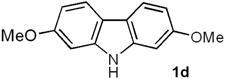 2,7-Dimethoxy-9H-carbazole (Clausine V, 1d). Following the procedure described for 1h, with 5d (0.100 g, 0.44 mmol), Pd(AcO)2 (0.0099 g, 0.044 mmol) and Cu(AcO)2 (0.198 g, 1.10 mmol), 1d (0.089 g, 90%) was obtained as a white solid. Rf 0.56 (hexane/EtOAc, 7:3); mp 229–230 °C [Lit. [22] 228–230 °C]. IR (KBr): νmax 3382, 2927, 1608, 1575, 1502, 1457, 1322, 1265, 1233, 1160, 1118, 1026, 825, 805 cm−1. 1H-NMR (300 MHz, DMSO-d6/acetone-d6, 3:7): δ = 3.85 (s, 6H, 2CH3O), 6.75 (dd, J = 8.4, 2.4 Hz, 2H, H-3, H-6), 6.99 (d, J = 2.4 Hz, 2H, H-1, H-8), 7.85 (d, J = 8.4 Hz, 2H, H-4, H-5), 10.81 (br s, 1H, NH). 13C-NMR (75.4 MHz, DMSO-d6/acetone-d6, 3:7): δ = 54.9 (2CH3O), 94.6 (C-1, C8), 107.3 (C-3, C-6), 116.8 (C-4a, C-4b), 119.7 (C-4, C-5), 141.4 (C-8a, C-9a), 157.9 (C-2, C-7). MS (70 eV): m/z (%) 227 (M+, 77), 212 (100), 184 (42), 169 (54), 153 (13), 141 (27), 114 (5). HRMS (EI): m/z [M+] calcd for C14H13NO2: 227.0946; found: 227.0946.