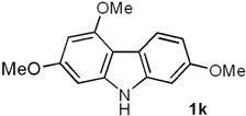 2,4,7-Trimethoxy-9H-carbazole (1k). Following the procedure described for 1h, with 5e (0.101 g, 0.39 mmol), Pd(AcO)2 (0.0087 g, 0.039 mmol) and Cu(AcO)2 (0.175 g, 0.97 mmol), 1k (0.092 g, 92%) was obtained as a white solid. Rf 0.20 (hexane/EtOAc, 7:3); mp 167–168 °C. IR (KBr): νmax 3383, 1617, 1580, 1510, 1453, 1428, 1260, 1213, 1149, 1119, 1032, 803 cm−1. 1H-NMR (500 MHz, CDCl3/acetone-d6, 7:3): δ = 3.83 (s, 6H, 2CH3O), 3.98 (s, 3H, CH3O), 6.27 (d, J = 1.3 Hz, 1H, H-3), 6.46 (d, J = 1.3 Hz, 1H, H-1), 6.76 (dd, J = 8.5, 2.2 Hz, 1H, H-6), 6.82 (d, J = 2.2 Hz, 1H, H-8), 7.99 (d, J = 8.5 Hz, 1H, H-5), 9.32 (br s, 1H, NH). 13C-NMR (125 MHz, CDCl3/acetone-d6, 7:3): δ = 54.7 (CH3O), 54.9 (CH3O), 55.0 (CH3O), 86.7 (C-1), 90.2 (C-3), 94.0 (C-8), 106.0 (C-4a), 107.0 (C-6), 116.1 (C-4b), 121.7 (C-5), 139.7 (C-8a), 141.3 (C-9a), 155.2 (C-4), 156.8 (C-7), 158.7 (C-2). MS (70 eV): m/z (%) 257 (M+, 39), 247 (36), 230 (100), 219 (24), 214 (22), 190 (82), 176 (21), 160 (19), 117 (7). HRMS (EI): m/z [M+] calcd for C15H15NO3: 257.1052; found: 257.1052.