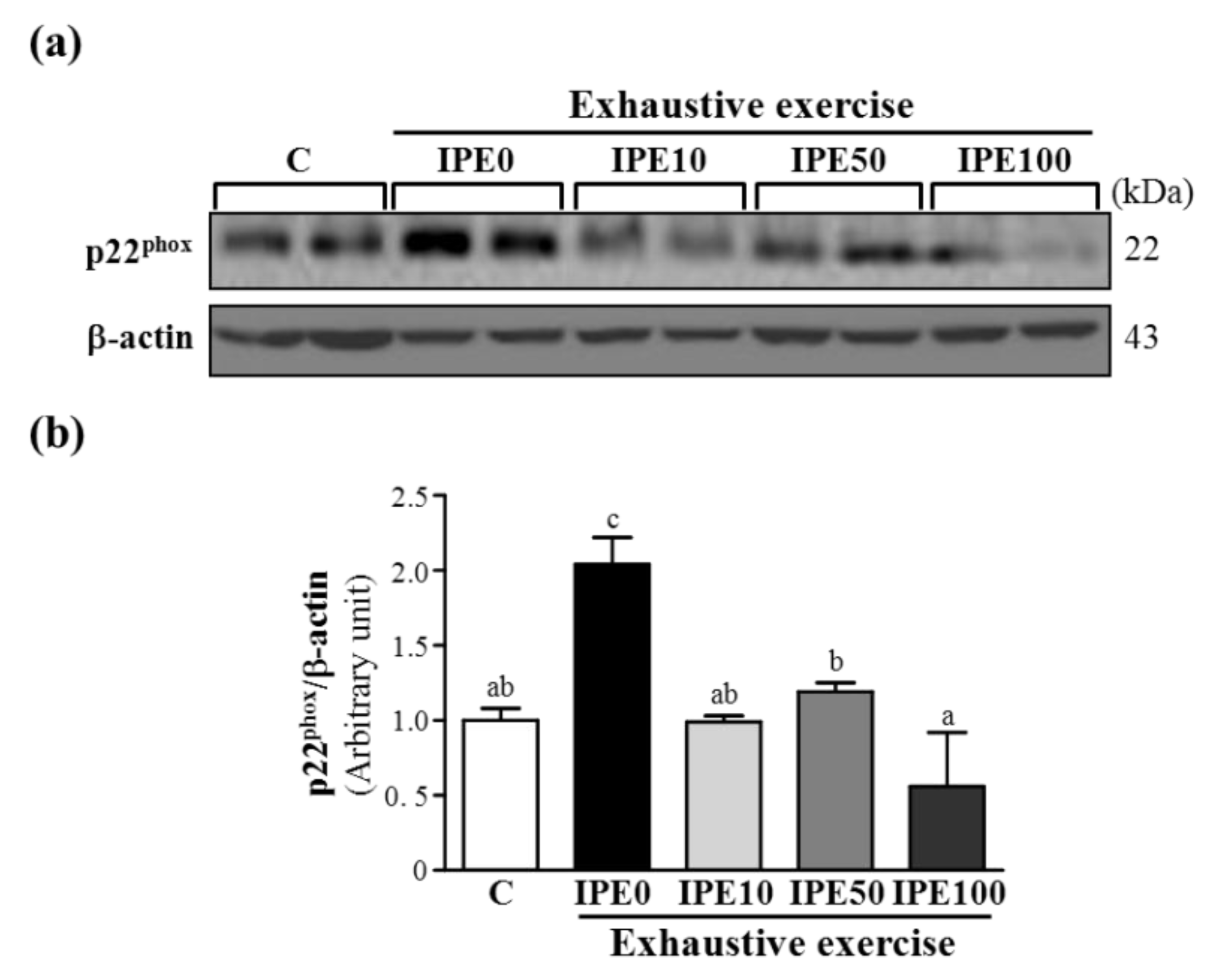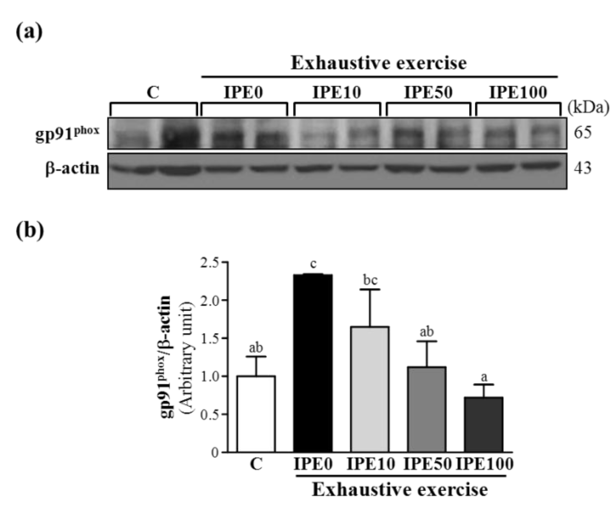 2.3. Effects of IPE Supplementation on the gp91phox, p22phox, and p47phox subunits of Nicotinamide Adenine Dinucleotide Phosphate (NADPH) Oxidase Complex Expression in Liver Tissue