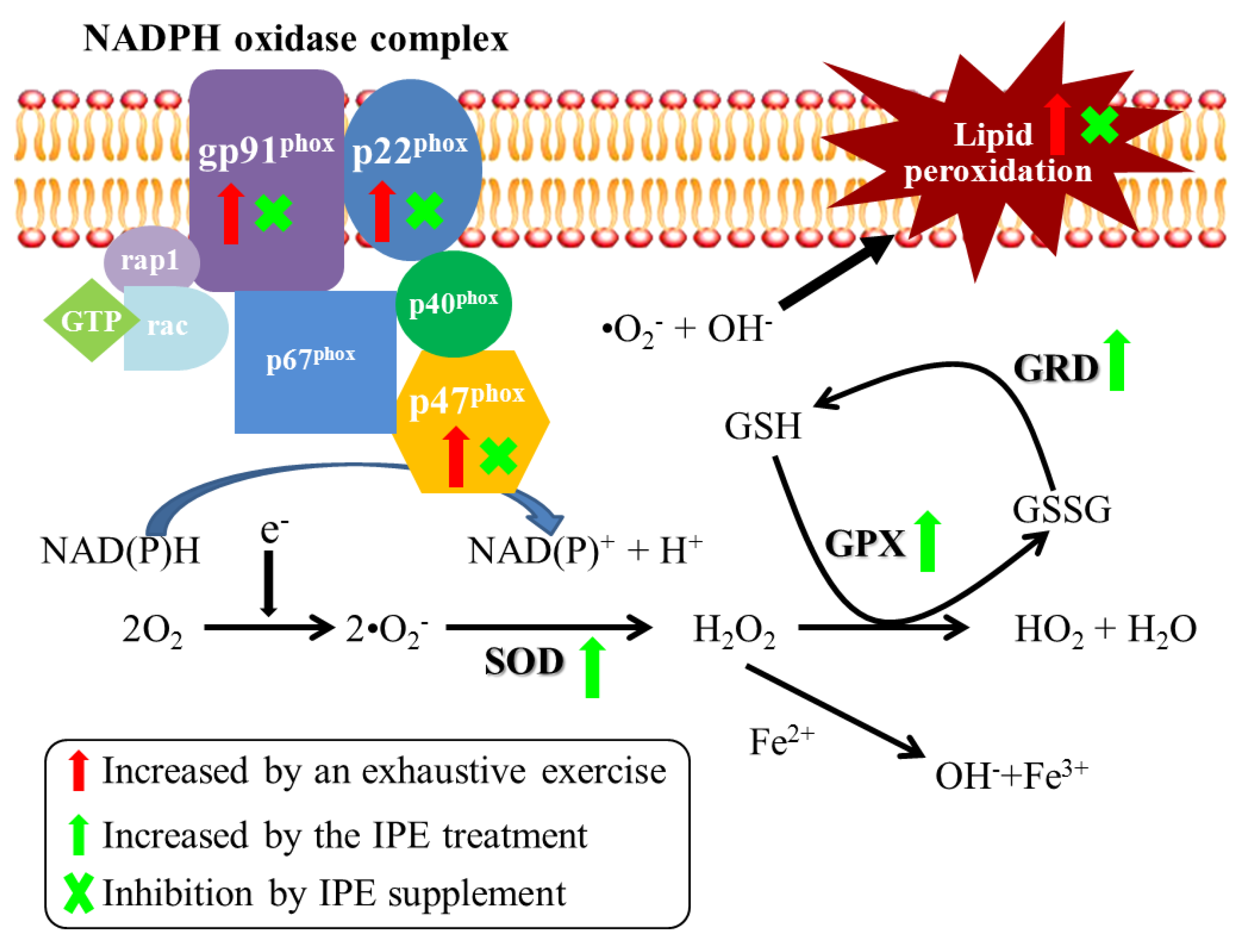 ) represent upregulation by exhaustive exercise challenge and IPE treatment, respectively. The (×) symbol represents inhibition by IPE treatment.