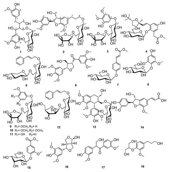 - Xiong, L.; Zhu, C.; Li, Y.; Tian, Y.; Lin, S.; Yuan, S.; Hu, J.; Hou, Q.; Chen, N.; Yang, Y. Lignans and neolignans from Sinocalamus affinis and their absolute configurations. J. Nat. Prod. 2011, 74, 1188–1200. [Google Scholar] [CrossRef]