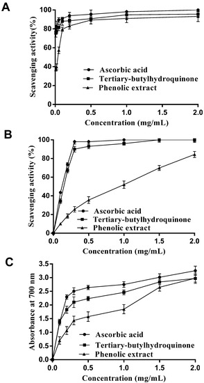 Reducing power is one of the mechanisms of antioxidant actions and may serve as a significant indicator of potential antioxidant activity [25]. The presence of the antioxidant results in the reduction of the Fe3+/ferricyanide complex to the Fe2+ form [26] and a chance of absorbance of the reaction mixtures. A higher absorbance indicates a stronger reducing power. As seen in Figure 1C, the phenolic extract displayed concentration-dependent reducing power, which was weaker than that of ascorbic acid and tert-butylhydroquinone.