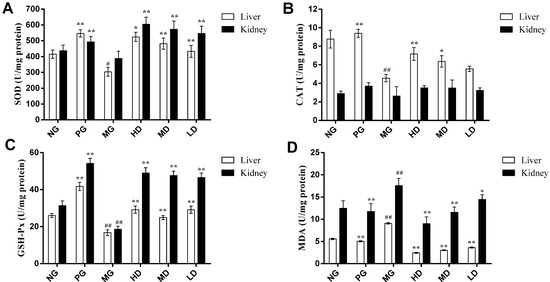 SOD is a superoxide radical scavenging factor converted superoxide radicals to H2O2 [29]. Figure 2A shows the SOD activities in liver and kidney of mice after the experiment. Compared with normal group (NG), a decrease was observed for SOD activities of model group (MG). As shown in Figure 2A, SOD activities level of liver was significantly decreased on MG (p < 0.05) and that of kidney was not significant (p > 0.05) when compared with NG.