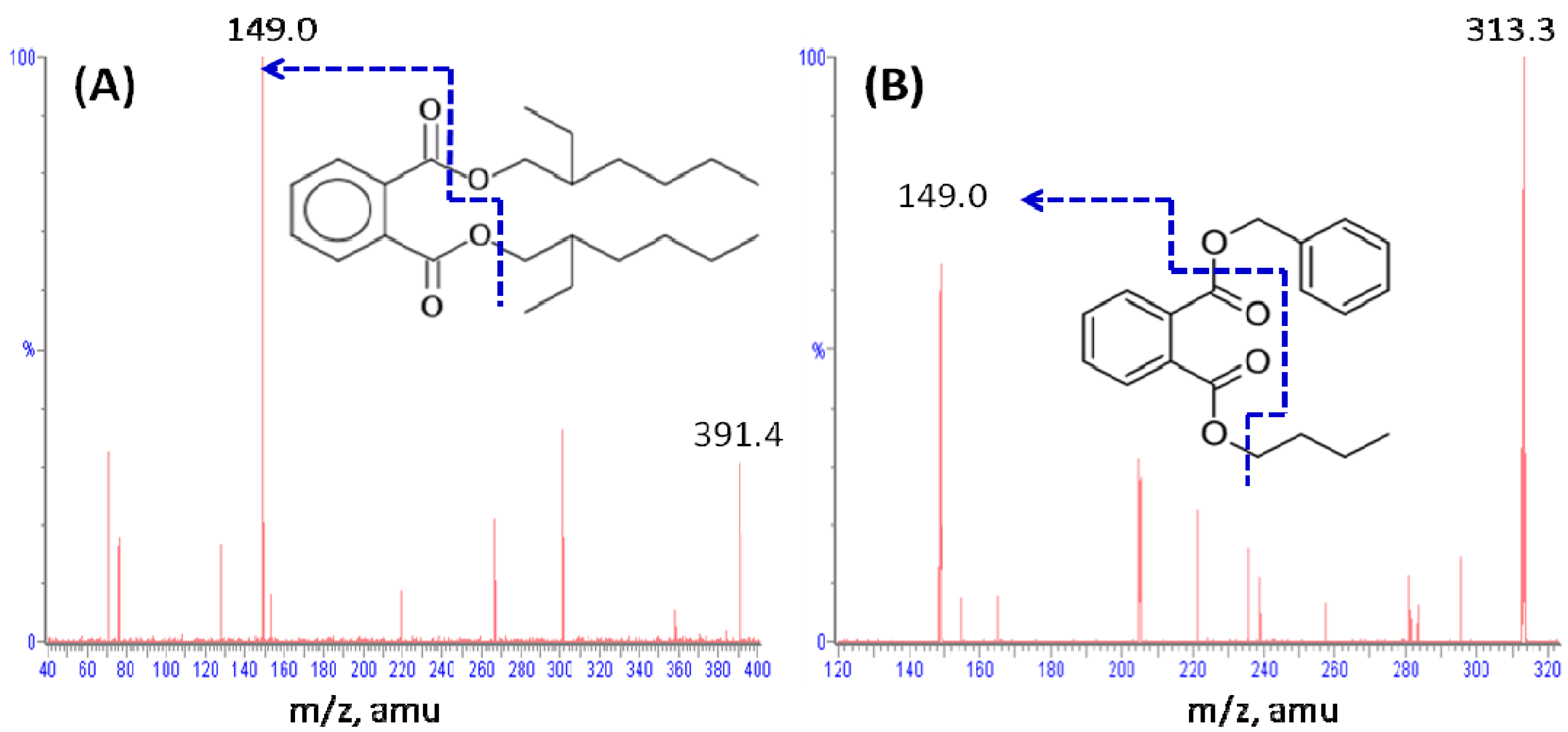 - Sjoberg, P.; Bondesson, U. Determination of di(2-ethylhexyl) phthalate and four of its metabolites in blood plasma by gas chromatography-mass spectrometry. J. Chromatogr. 1985, 344, 167–175. [Google Scholar]