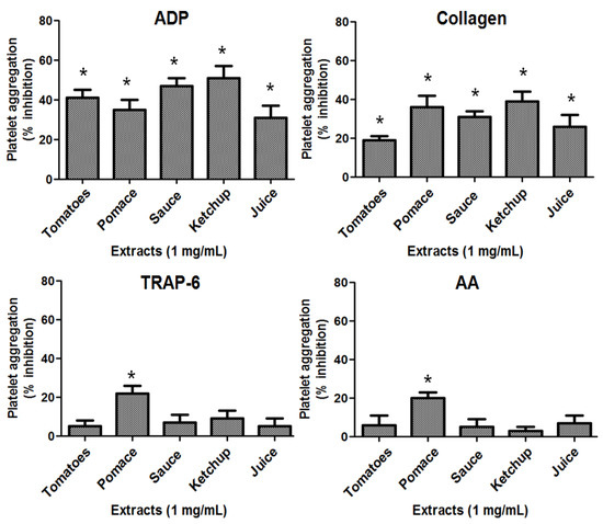 Pomace extract presents the best antiplatelet activity [14] because it inhibits platelet aggregation by different activation pathways: ADP, collagen, TRAP-6 and AA. Pomace is a byproduct of industrial processing of tomatoes into paste and canned products. It mainly consists of seeds and the peel [23]. However, apart from lycopene pomace still contains other valuable compounds exerting complementary biological activities as antiplatelet activity (chlorogenic, caffeic, p-coumaric and ferulic acids). This form of pomace extract exerted a potent inhibition of platelet aggregation induced by ADP, collagen, TRAP-6 and AA. Considering the different agonists tested in this study, the inhibition of platelet aggregation by the pomace extract was in the following order: collagen (36 ± 6%) > ADP (35 ± 5%) > TRAP-6 (22 ± 4%) > AA (20 ± 3%) as compared to control (p < 0.05). Although the pomace is a product of industrial processing of tomatoes, it presents high amounts of crude fiber and protein [24]. Therefore, the intake of functional compounds from pomace may be associated with the reduction of cardiovascular risk through antiplatelet activity.